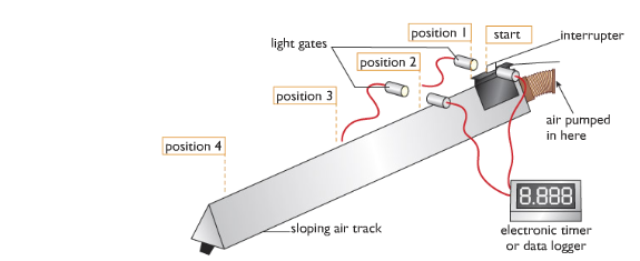 From the diagram show the investigation where we can see that the air-track reduces friction because the glider rides on a cushion of air that is pumped continuously through holes along the air track. As the glider accelerates down the sloping track the white card mounted on it breaks a light beam, and the time the glider takes to pass is measured electronically. If the length of the card is measured, and this is entered into the spreadsheet, the velocity of the glider can be calculated by the spreadsheet programme using v = d/t.