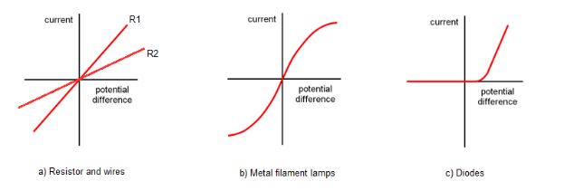 2.10 describe how current varies with voltage in wires, resistors, metal filament lamps and diodes, and how this can be investigated experimentally