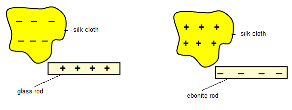 - Two silk clothes are taken. When the glass rod is rubbed with the silk cloth, the glass rod becomes positively charged. Again, when with another silk cloth, the ebonite rod is rubbed, it becomes negatively charged.