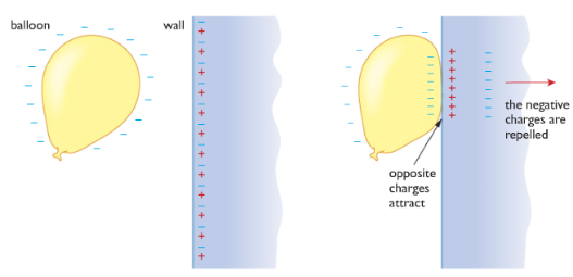 As the negatively charged balloon is bought closer to the wall some of the negative electrons are repelled from the surface of the wall. This gives the surface of the wall a slight positive charge that attracts the negatively charged balloon.