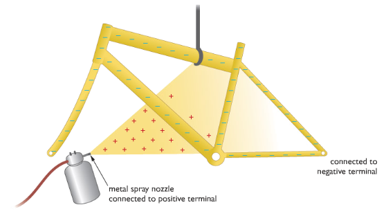 Painting an awkwardly shaped object such as bicycle frame with a spray can be very time consuming and very wasteful of paint. Using Electrostatic spraying can be the process efficient.