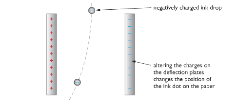 Many modern printers use inkjets to direct a fine jet of ink drops onto paper. Each spot of ink is given a charge so that as it falls between a pair of deflecting plates, electrostatic forces direct it to the correct position. The charges on the plates change hundreds of times each second so that each drop falls in a different position, forming pictures and words on the paper as required.