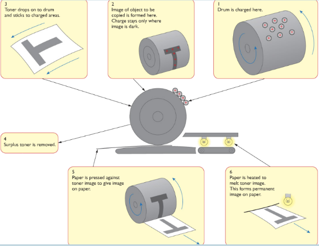 In photocopiers, the paper is shone in bright light which reflects to a rotating drum. The dark writings and pictures do not reflect. As a result the light removes the charges in the drum. Carbon powder attaches to the charges in the drum and the pictures and writings are pasted into a sheet of paper.