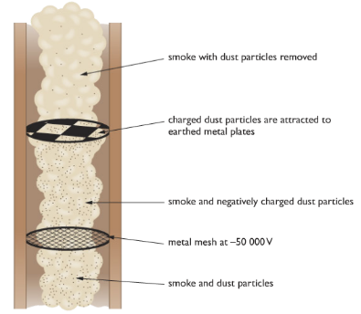 As the smoke initially rises up the chimney, it passes through a mesh of wires that are highly charged. As they pass through the mesh, the ash and dust particles become negatively charged. Higher up the chimney these charged particles are attracted by and stick to large metal earthed plates. The cleaner smoke is then released into the atmosphere. When the earthed plates are completely covered with dust and ash, they are given a sharp rap. The dust and ash fall into collection boxes, which are later emptied.