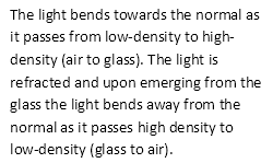 The light bends towards the normal as it passes from low-density to high-density (air to glass). The light is refracted and upon emerging from the glass the light bends away from the normal as it passes high density to low-density (glass to air).