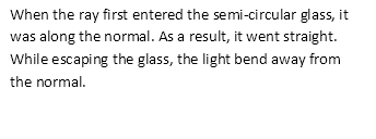 When the ray first entered the semi-circular glass, it was along the normal. As a result, it went straight. While escaping the glass, the light bend away from the normal.