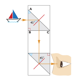 Light passes normally through the surface AB of the first prism (that is, it enters the prism at 90o) and so is undeviated. It then strikes the surface AC of the prism at angle of 45o. The critical angle for glass is 42o so the ray is totally internally reflected and is turned through 90o. On emerging from the first prism the light travels to a second prism which is positioned such that the ray is again totally internally reflected. The ray emerges parallel to the direction in which it was originally travelling.