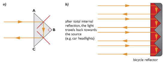 Light entering the prism undergoes total internal reflection twice. It emerges from prism travelling back in the direction from which it originally came. This arrangement is used in bicycle reflectors and binoculars.