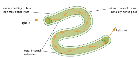 Optical fibre uses the property of total internal reflection. This is very thin strand composed of two different types of glass. The inner core is more optically dense than the outer one. As the fibres are narrow, light entering inner core always strike the boundary of the two glasses at an angle greater than critical angle. This technique is used to send information very fast at the speed of light.