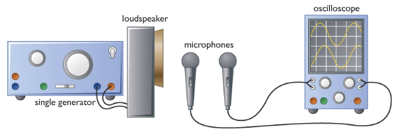 The apparatus is set up as in the figure. Set the signal generator to give a sound with frequency of about 1kHz. Start with the microphones close together, and observe how the two traces on the oscilloscope compare. Then move one microphone further away from the loudspeaker until it is one complete wavelength away from the first – you know you have arrived at this point when the traces one the oscilloscope screen are exactly above one another. Measure the distance between the microphone to get the wavelength of the sound, and use the oscillioscope screen to find an accurate value for the frequency. The speed of sound can then be worked out using the formula v=f×λ.
